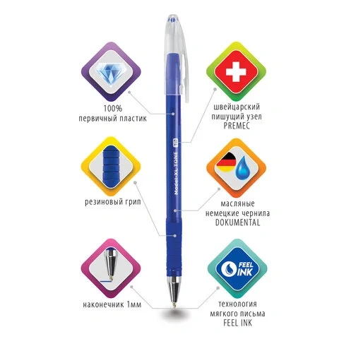 Модель изготовлена из высококачественных материалов, сменный стержень длиной 140 мм снабжен швейцарским стандартным наконечником фирмы PREMEC и заправлен немецкими чернилами на масляной основе DOKUMENTAL синего цвета. Удобная прорезиненная зона захвата. Специальная технология 'FEEL INK' гарантирует лёгкое и четкое письмо без каких-либо усилий. Диаметр пишущего узла 1 мм создает аккуратную линию письма, равную 0,5 мм. Благодаря грипу удобство использования ручки возрастает в десятки раз. Синий корпус соответствует классическому офисному стилю.
