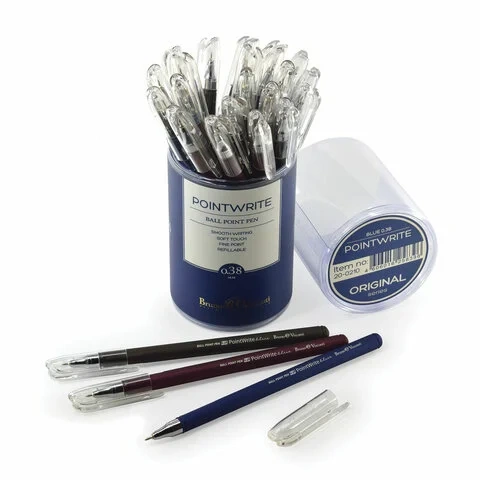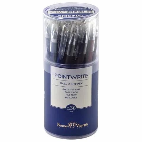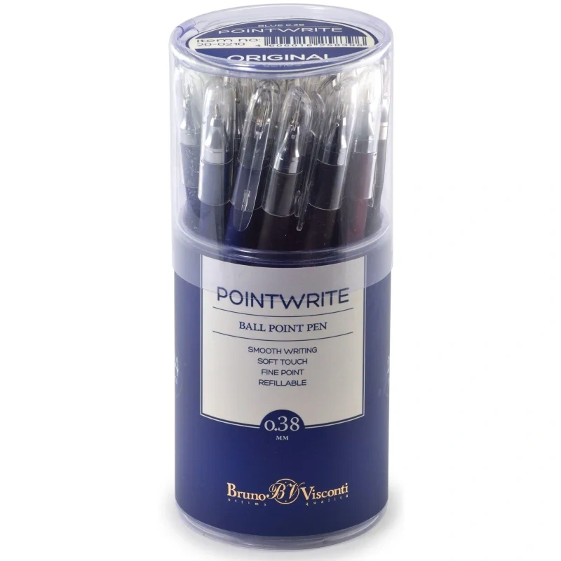 Шариковая неавтоматическая ручка Bruno Visconti PointWrite Original. Вид чернил: пигментные чернила Documental. Корпус выполнен из пластика со специальным покрытием Silk Touch. Тип пишущего узла: полуигольчатый, толщина линии письма 0,38 мм. Цвет чернил: синий. Сменный стержень. Производство: Китай. Расходные материалы для данной ручки не представлены в ассортименте производителя и в ассортименте компании Комус.