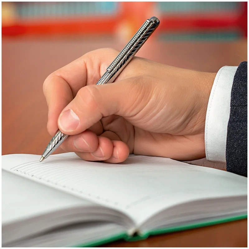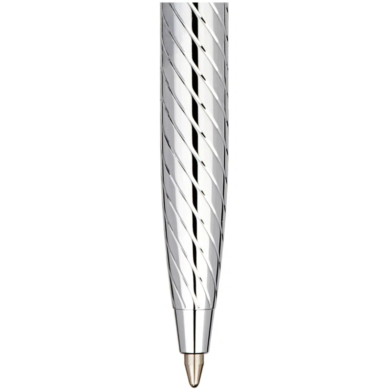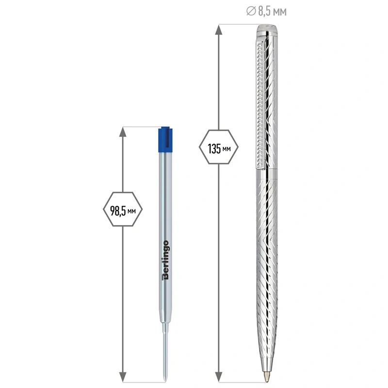 Delucci Argento – это роскошная подарочная шариковая ручка с синими чернилами, которую оценит любой человек. Серебристый корпус дополнен множеством элементов: опоясывающей гравировкой в виде зигзагообразных линий, клипом с тиснением, ненавязчивым логотипом. Клип сделан из нержавеющей стали, он позволяет фиксировать ручку на ежедневниках, блокнотах и карманах одежды. Delucci Argento оснащена поворотным механизмом, внутри которого расположен пишущий стержень диаметром 1 мм, который идеально подходит для быстрого стиля письма. Упакована в кожаный футляр.