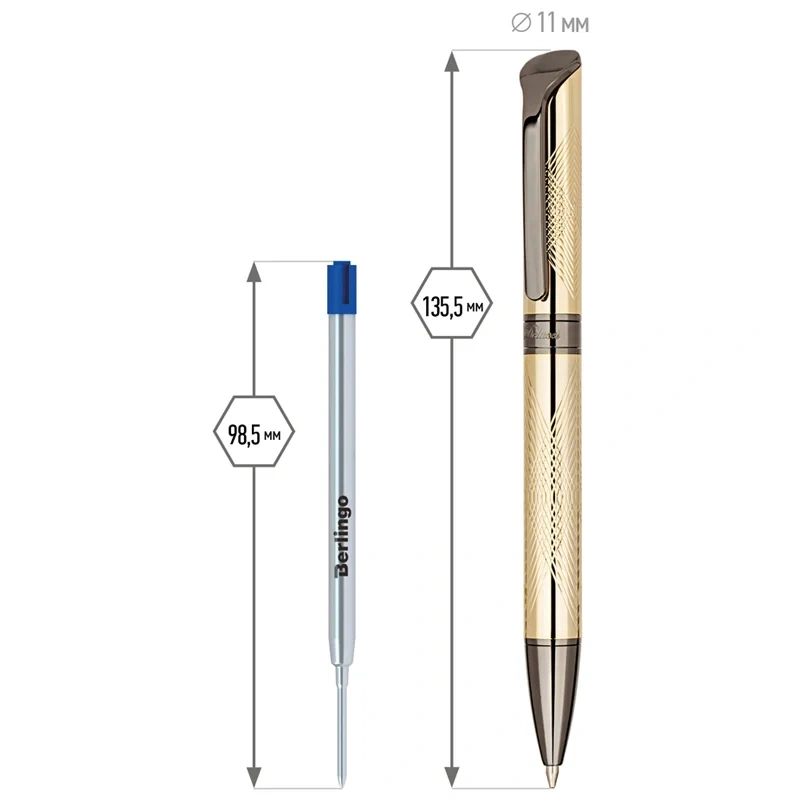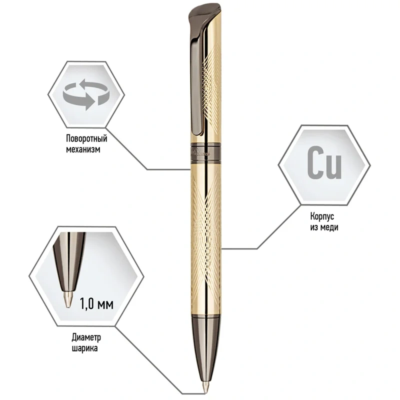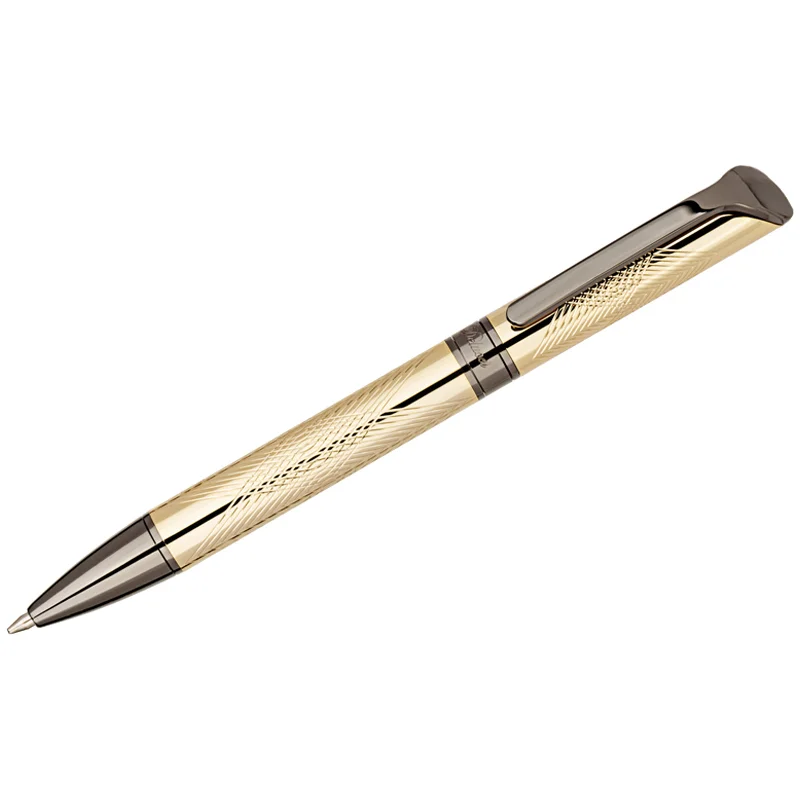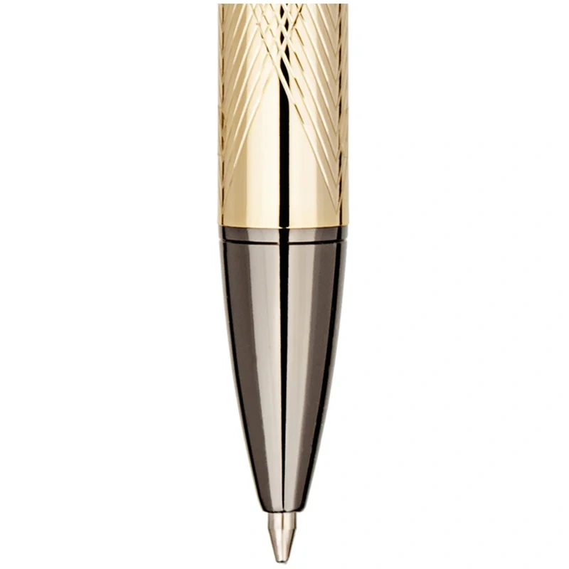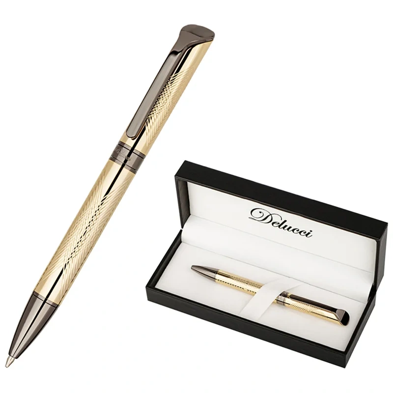 Delucci Completo – это роскошная подарочная шариковая ручка с синими чернилами, которую оценит любой человек. Золотой корпус из меди украшен гравировкой в форме разнонаправленных «ёлочек», а также деталями цвета оружейного металла. Клип сделан из нержавеющей стали, он позволяет фиксировать ручку на ежедневниках, блокнотах и карманах одежды. Delucci Completo оснащена поворотным механизмом, внутри которого расположен пишущий стержень диаметром 1 мм, который идеально подходит для быстрого стиля письма. Упакована в кожаный футляр.
