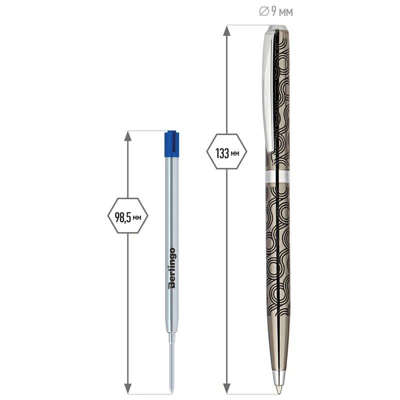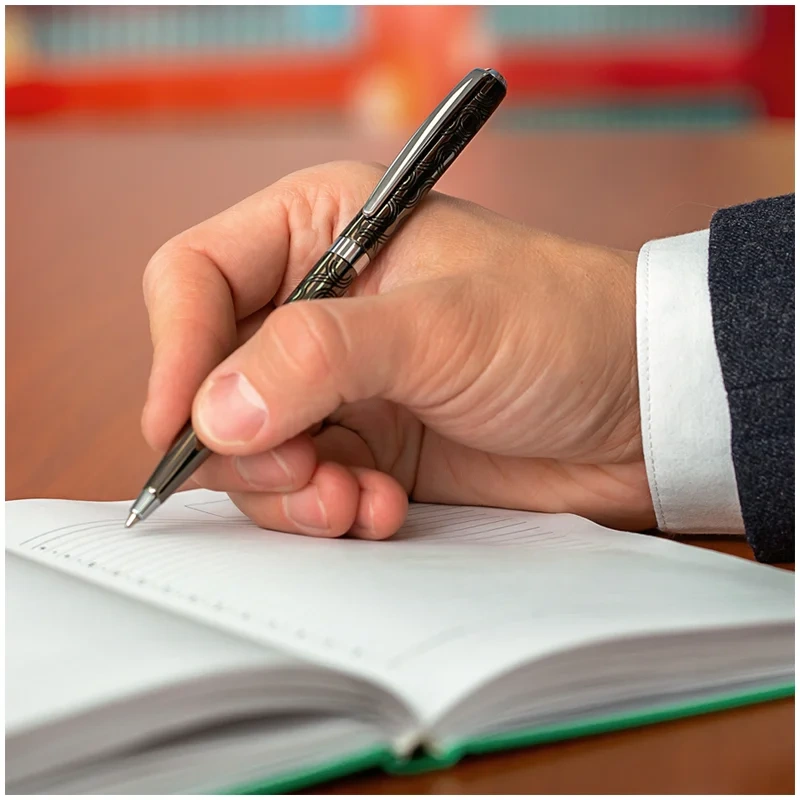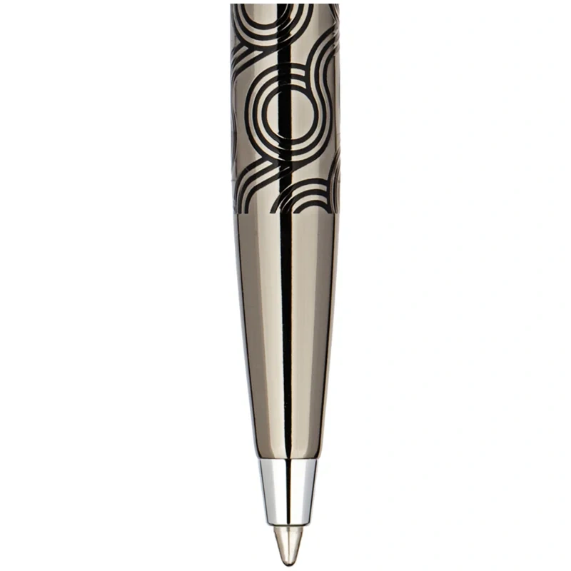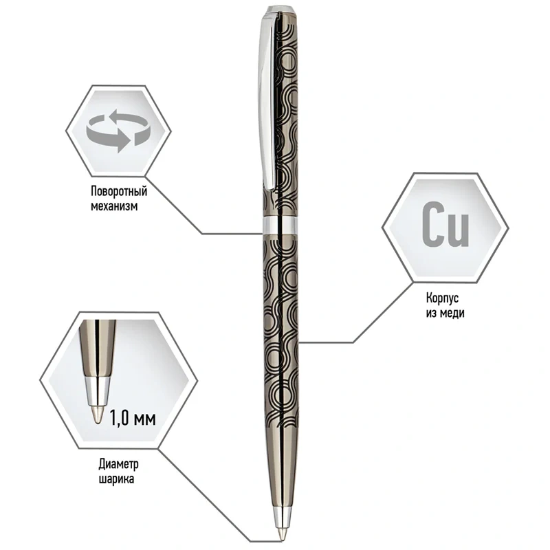 Delucci Motivo – это роскошная подарочная шариковая ручка с синими чернилами, которую оценит любой человек. Её корпус цвета оружейного металла украшен кругообразной черной гравировкой и серебристыми вставками. Он изготовлен из меди, что обеспечивает оптимальный вес для комфортного письма. Клип сделан из нержавеющей стали, он позволяет фиксировать ручку на ежедневниках, блокнотах и карманах одежды. Delucci Motivo оснащена поворотным механизмом, внутри которого расположен пишущий стержень диаметром 1 мм, который идеально подходит для быстрого стиля письма. Упакована в кожаный футляр.