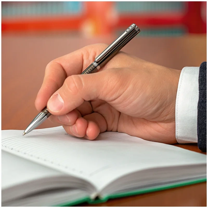 Delucci Stella – это изысканная подарочная шариковая ручка с синими чернилами, которая является образцом классического подарка для коллеги или любимого человека. Классический дизайн с утонченным клипом дополняет инкрустированный в него кристалл. Клип сделан из нержавеющей стали, он позволяет фиксировать ручку на ежедневниках, блокнотах и карманах одежды. Delucci Stella оснащена поворотным механизмом, внутри которого расположен пишущий стержень диаметром 1 мм, который идеально подходит для быстрого стиля письма. Упакована в кожаный футляр.