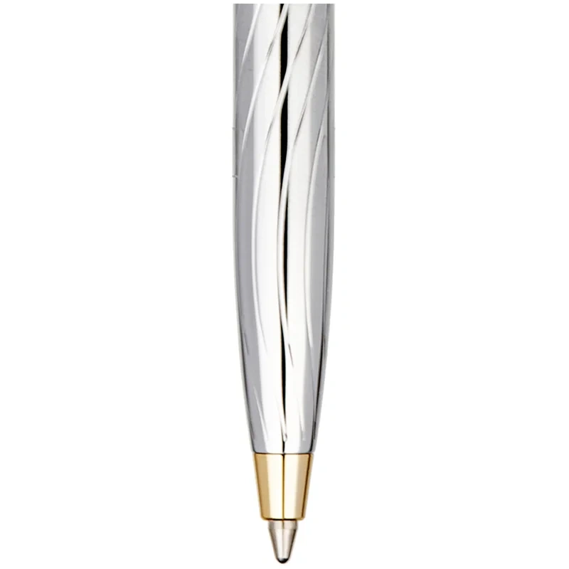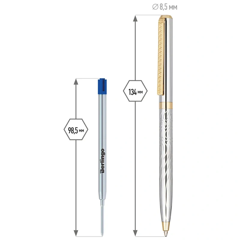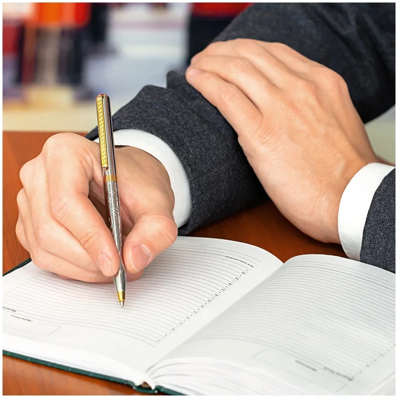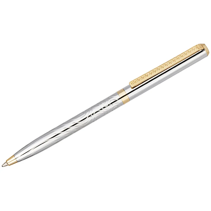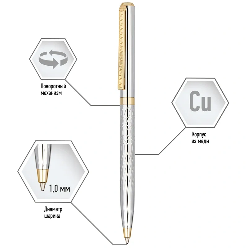 Шариковая подарочная ручка Delucci Tempo с синими чернилами – это яркое сочетание серебряного корпуса с золотыми деталями. Медь и никелированное гарантируют надежность и долговечность, а вычурности добавляет гравировка на клипе и торце, которая напоминает египетские мотивы. Клип сделан из нержавеющей стали, он позволяет фиксировать ручку на ежедневниках, блокнотах и карманах одежды. Delucci Tempo оснащена поворотным механизмом, внутри которого расположен пишущий стержень диаметром 1 мм, который идеально подходит для быстрого стиля письма. Упакована в кожаный футляр.