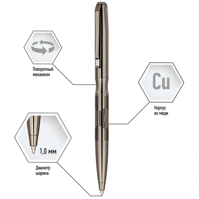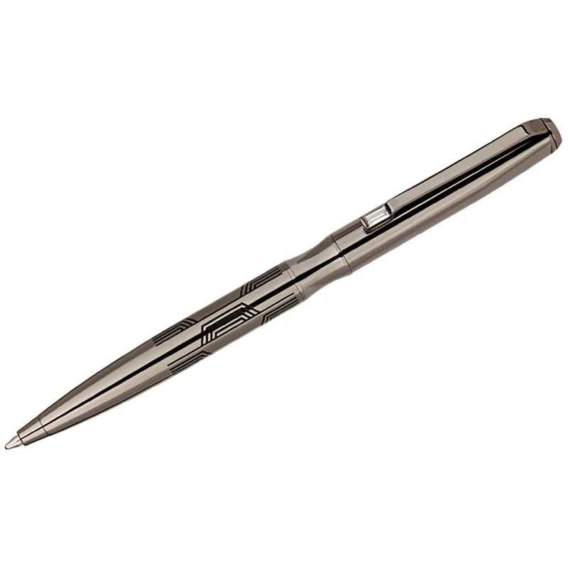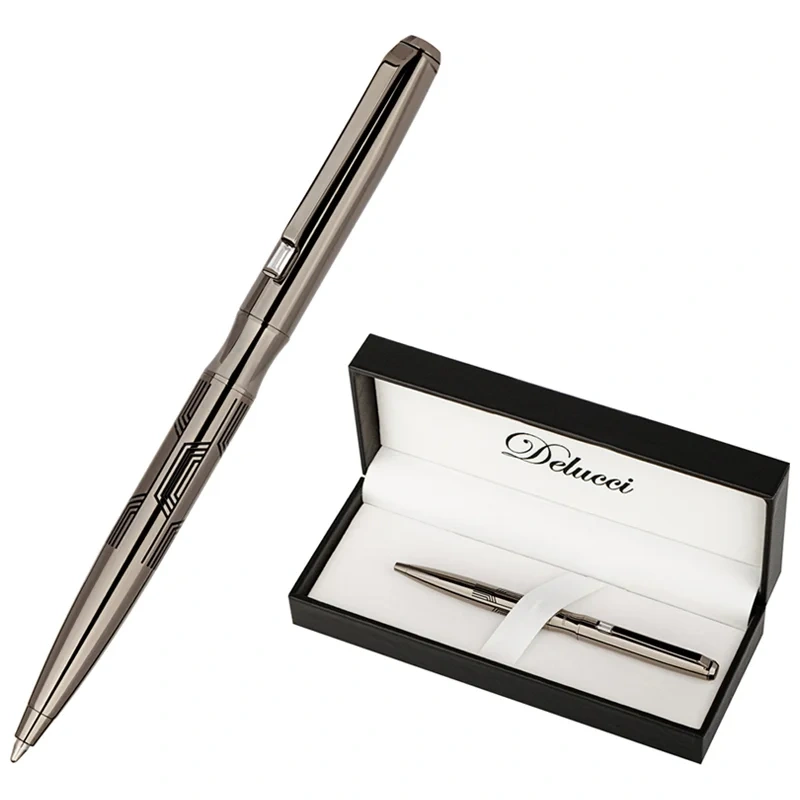 Delucci Universo – это роскошная подарочная шариковая ручка с синими чернилами, которую оценит любой человек. Она выполнена в цвете оружейного металла, на колпачок и корпус нанесена интересная гравировка в виде изогнутых ассиметричных опоясывающих линий. Корпус увеличенного диаметра придает ей солидный вес и приятное ощущение при письме. Клип сделан из нержавеющей стали, он позволяет фиксировать ручку на ежедневниках, блокнотах и карманах одежды. Delucci Universo оснащена поворотным механизмом, внутри которого расположен пишущий стержень диаметром 1 мм, который идеально подходит для быстрого стиля письма. Упакована в кожаный футляр.