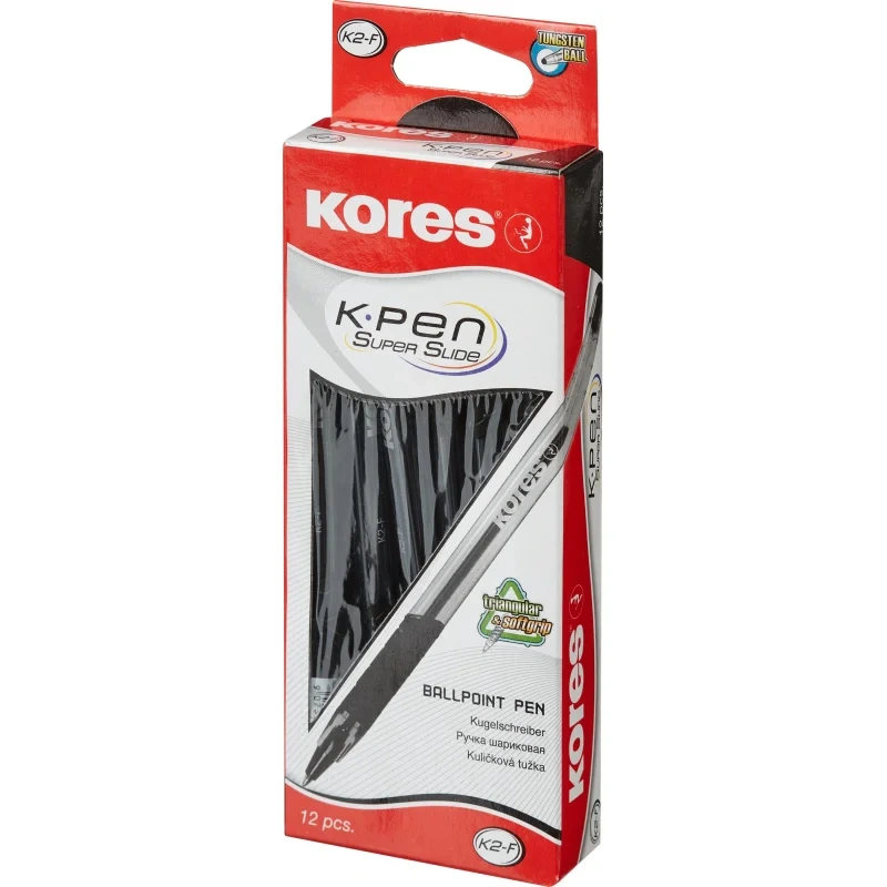 Шариковая ручка с треугольным корпусом KORES. Треугольная форма корпуса наиболее удобна и эргономична. Одноразовая, неавтоматическая. Резиновая манжетка способствует надежному захвату пальцев и препятствует выскальзыванию. Толщина линии 0,5 мм. Диаметр шарика 0,7 мм. Длина письма — 2000 метров. Полупрозрачный пластиковый корпус. Цвет корпуса — черный Цвет чернил — черный