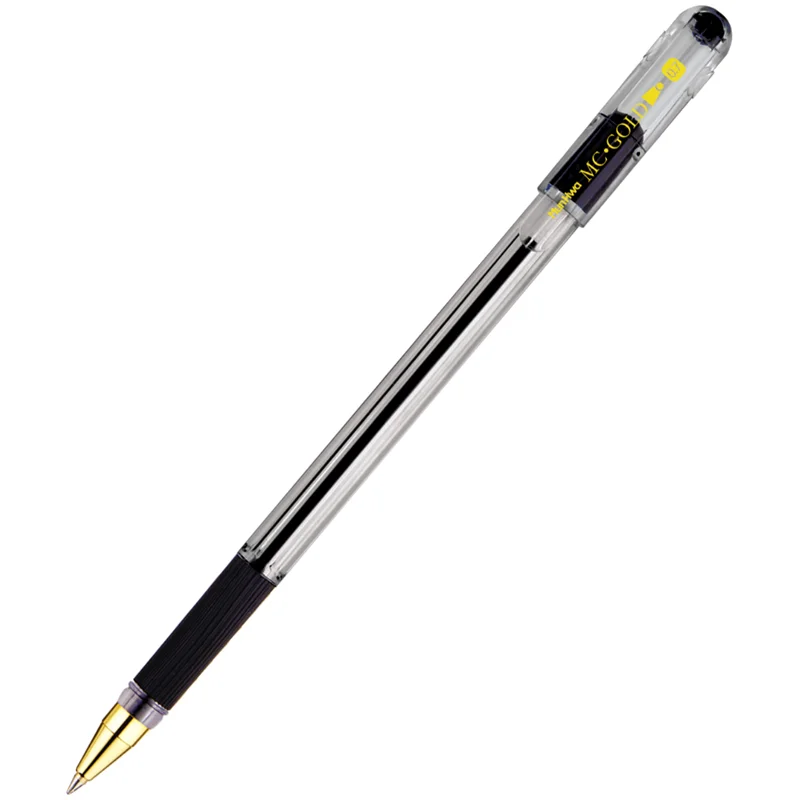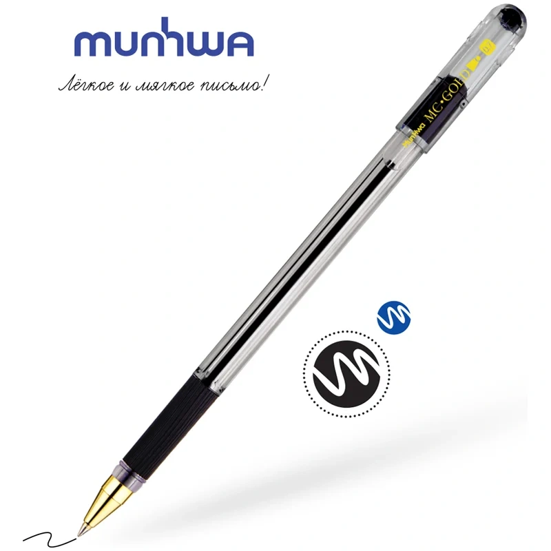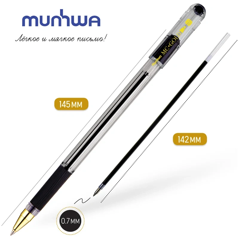 Легендарная шариковая ручка MunHwa MC Gold - одна из самых узнаваемых шариковых ручек. Диаметр пишущего узла составляет 0,7 мм. Толщина линии письма – 0,5 мм, а длина линии письма – 800 м. Ручки упакованы в картонную коробку по 12 штук. Ручка проработана до мельчайших деталей: прозрачный шестигранный корпус диаметром 8,3 мм отлично сочетается с золотым наконечником и ребристым противоскользящим грипом под чёрный цвет чернил. Уникальные чернила на масляной основе обеспечивают мягкое, ровное письмо и уверенное скольжение по бумаге. У ручки MunHwa MC Gold есть возможность менять стержень, она многоразовая. Сочетание комфортного письма и безупречного стильного дизайна сделало её абсолютным лидером российского рынка.