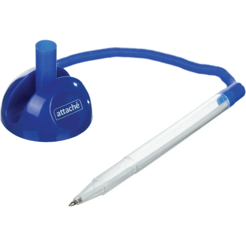 Шариковая ручка на подставке с синим цветом чернил. Модель представлена в пластиковом прозрачном корпусе с элементами синего цвета. Изделие прикреплено к подставке с помощью резинового шнура-пружины. Благодаря липкому слою на основании подставка может быть жестко зафиксирована практически на любой ровной поверхности. При письме стержень, оснащенный шариком, оставляет линию, толщина которой составляет 0,35 мм. Возможна замена стержня. Удобна для использования в офисах и различных учреждениях. Для фиксации ручки на поверхности удалите слой защитной пленки с клейкого основания.