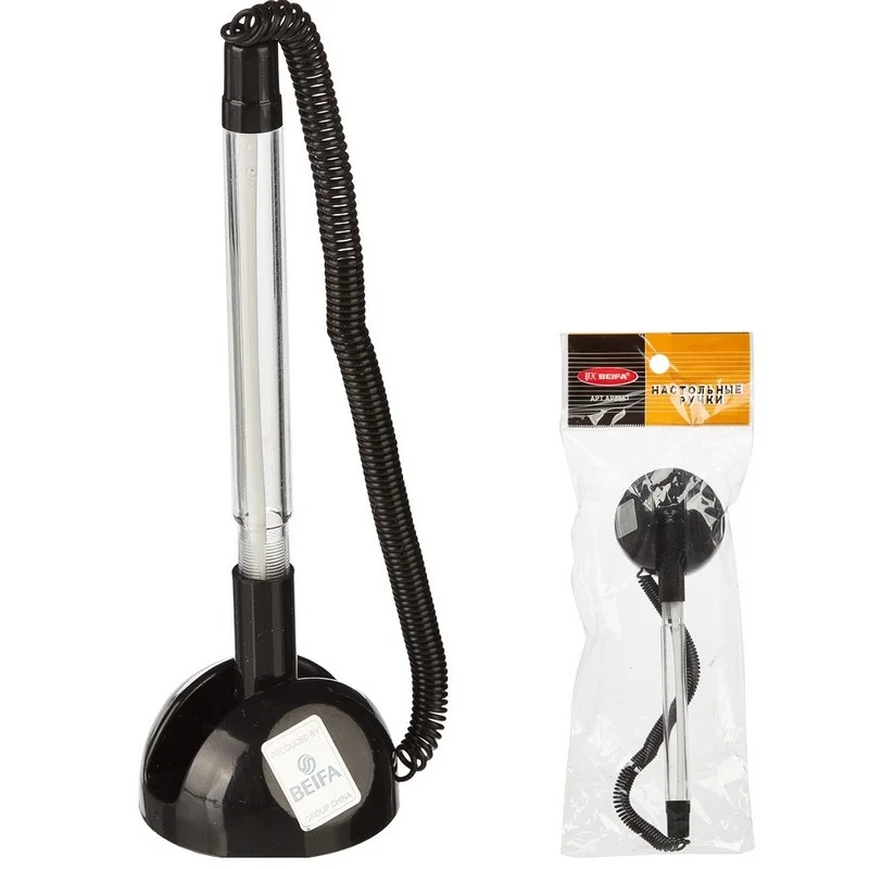 Шариковая ручка Beifa в подставке с синим цветом чернил. Модель представлена в корпусе прозрачного цвета с деталями черного цвета, выполненном из пластика. Изделие прикреплено к подставке с помощью резинового шнура-пружины. Длина пружины ручки в ненатянутом состоянии 14 см, в натянутом — 133 см. Благодаря липкому слою на основании подставка может быть жестко зафиксирована практически на любой ровной поверхности. Диаметр подставки — 45 мм, высота — 27 мм. При письме стержень, оснащенный шариком, оставляет линию, толщина которой составляет 0,5 мм. Возможна замена стержня. Дополнительные стержни для ручки вы сможете найти во вкладке «Расходные материалы». Удобна для использования в офисах и различных учреждениях. Для фиксации ручки на поверхности удалите слой защитной пленки с клейкого основания.