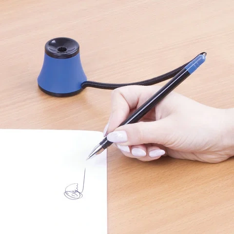 Корпус ручки прозрачный, подставка и детали ручки выполнены из пластика черного и синего цветов. Ручка крепится к подставке с помощью пружинки и фиксируется на любой ровной поверхности с помощью клейкого основания и с регулируемым углом наклона. Длина стержня составляет 136 мм. Диаметр основания - 5 см. Создает линию письма толщиной 0,35 мм. Цвет чернил - синий.