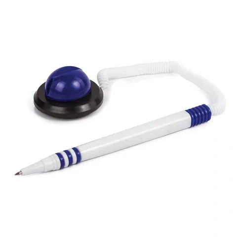 Корпус ручки и подставки выполнен из пластика белого цвета с синими деталями. Ручка крепится к подставке с помощью пружинки и фиксируется на любой ровной поверхности с помощью клейкого основания на подставке. Длина стержня составляет 106 мм. Диаметр основания - 4,4 см. Создает линию письма толщиной 0,5 мм. Цвет чернил - синий.