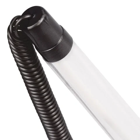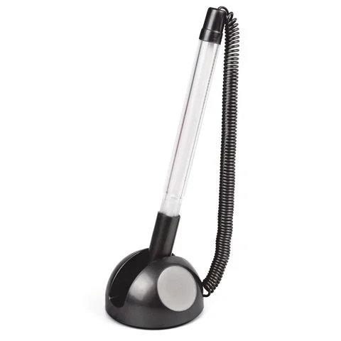 Корпус ручки прозрачный, подставка и детали ручки выполнены из пластика черного цвета. Ручка крепится к подставке с помощью пружинки и фиксируется на любой ровной поверхности с помощью клейкого основания и с регулируемым углом наклона. Длина стержня составляет 124 мм. Диаметр основания -4,5 см. Создает линию письма толщиной 0,5 мм. Цвет чернил - синий.
