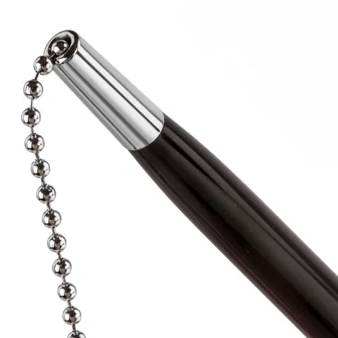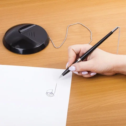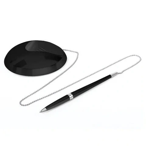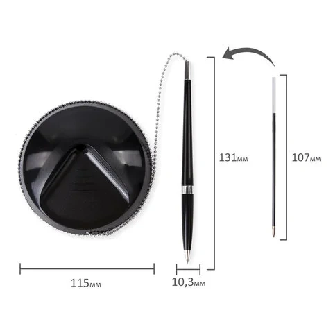 Корпус ручки и подставки выполнен из пластика черного цвета с хромированными деталями. Ручка крепится к подставке с помощью крепкой цепочки и фиксируется на любой ровной поверхности с помощью клейкого основания на массивной подставке. Длина стержня составляет 107 мм. Диаметр основания - 11,5 см. Создает линию письма толщиной 0,5 мм. Цвет чернил - синий.