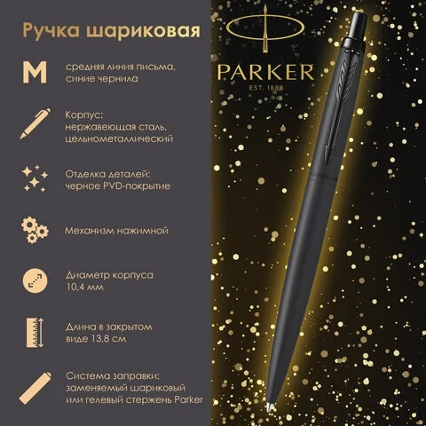 На кнопку ручки и зажим нанесено PVD-покрытие, которое отличает износостойкостью и устойчивостью к коррозии. Ручка поставляется в подарочной упаковке. Внутри находится одна шариковая ручка со стержнем. ВНИМАНИЕ! С марта 2020г. подарочные коробки ручек ТМ Parker прекратили комплектоваться лифлетами (листовками с гарантийным талоном).