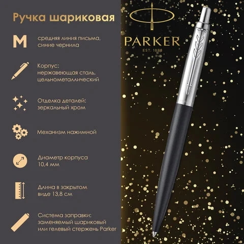 Легендарная ручка Jotter в новом утолщенном корпусе. Классический дизайн ручки был модифицирован, чтобы удовлетворить предпочтения тех, кому удобнее писать ручками большего размера. Длина, диаметр, вес были увеличены на 7%. При этом традиционна форма, зажим-стрела и фирменный 'клик' остаются неизменными. ВНИМАНИЕ! С марта 2020г. подарочные коробки ручек ТМ Parker прекратили комплектоваться лифлетами (листовками с гарантийным талоном).