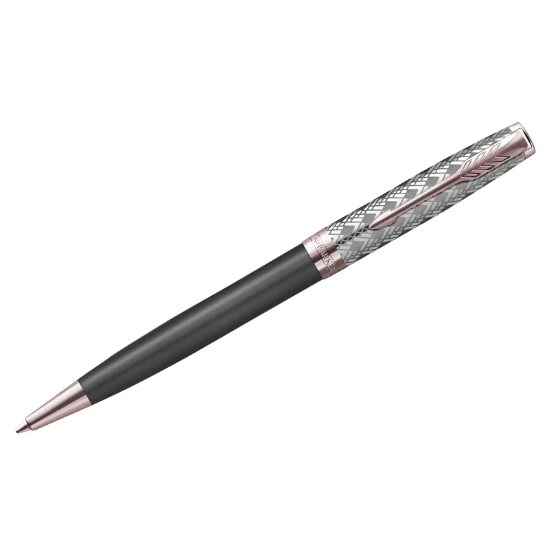 Ручка шариковая Parker 'Sonnet Metal&Grey PGT' , черная, 1,0мм с поворотным механизмом в подарочной упаковке. Ручка премиального сегмента с очень сложной и красивой гравировкой геометрического направления. Колпачок сделан из нержавеющей стали, отполирован, а его элементы покрыты тонким слоем розовой позолоты. ВНИМАНИЕ! С марта 2020г. подарочные коробки ручек ТМ Parker прекратили комплектоваться лифлетами (листовками с гарантийным талоном).