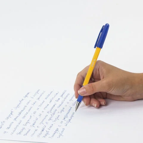 Шариковая ручка с оранжевым шестигранным корпусом и деталями в цвет чернил. В зоне захвата расположен мягкий резиновый держатель, благодаря которому использовать ручку будет комфортно на протяжении долгого времени. Длина сменного стержня составляет 142 мм, что позволит использовать ручку дольше. Диаметр пишущего узла, равный 0,7 мм, создает тонкую четкую линию письма, равную 0,35 мм. Цвет чернил - синий.