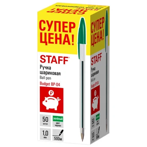 Шариковая ручка Staff Basic Budget BP-04 зеленая, 0.5мм, прозрачный корпус, одноразовая