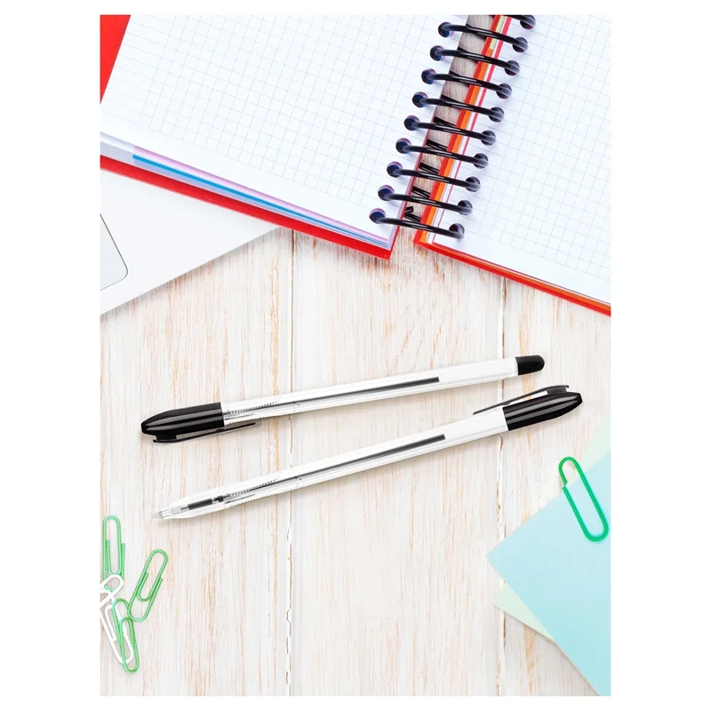 Шариковая ручка в прозрачном корпусе, со сменным стержнем. Корпус ручки имеет специальные насечки для удобного захвата. Обеспечена надежная фиксация колпачка. Масляные чернила обеспечивают комфортное письмо.