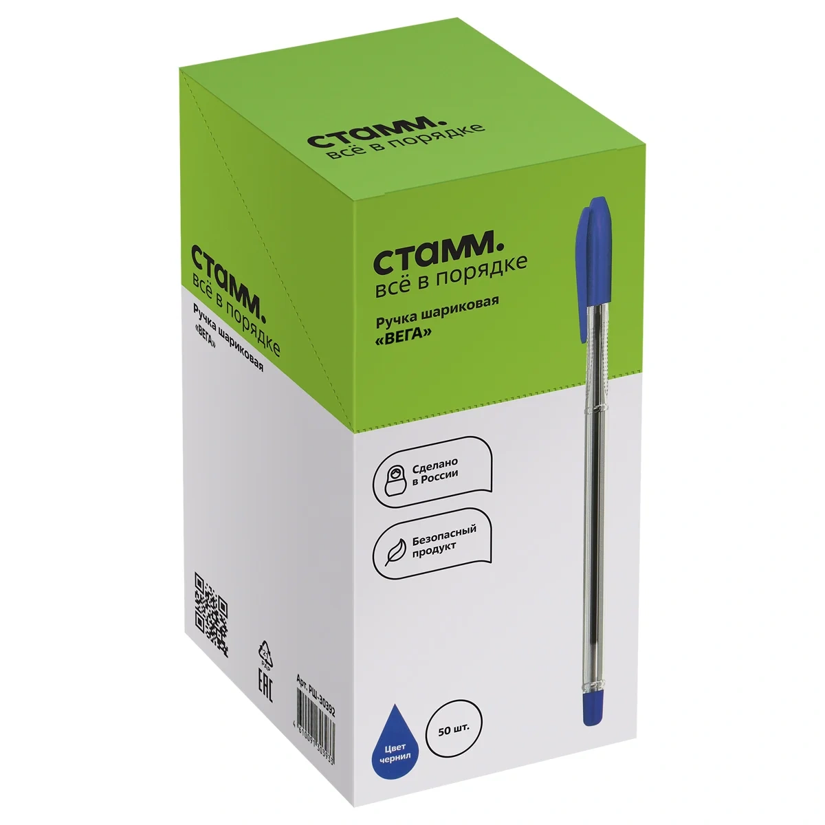 Шариковая ручка «СТАММ» серии «Вега» с вентилируемым колпачком имеет трёхгранную зону захвата с рифлением, препятствующую скольжению пальцев при письме. Прозрачный корпус позволяет контролировать расход чернил. Диаметр пишущего узла – 1 мм, толщина линии письма – 0,7 мм. Длина стержня – 152 мм. Износостойкий наконечник и синие чернила на масляной основе обеспечивают мягкое, ровное и комфортное письмо. Изделие изготовлено из качественных материалов, и идеально сочетает в себе функциональность и современный дизайн. Ручки поставляются в картонной коробке по 50 штук.