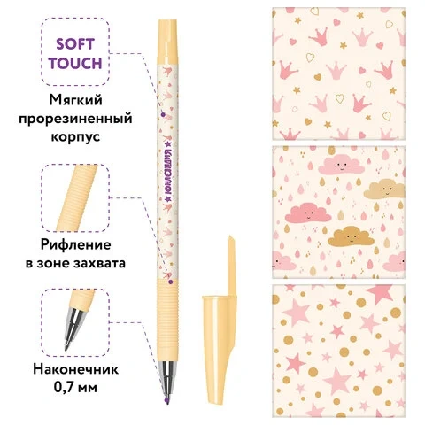 Шариковая ручка с SOFT TOUCH покрытием на корпусе и нежным принтом. Ручка имеет удобную прорезиненную зону захвата и стандартный наконечник. Диаметр пишущего узла, равный 0,7 мм, создает линию письма, равную 0,35 мм. Длина сменного стержня составляет 140 мм. Цвет чернил - синий.