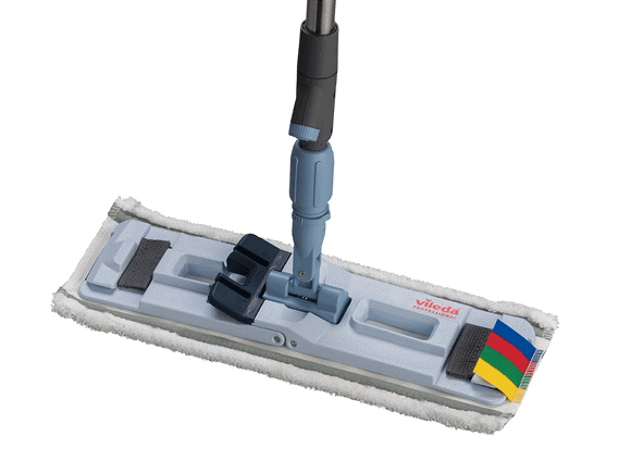 Возьмите ручку, подсоедините к любому держателю мопов Vileda Professional, залейте моющий раствор или воду в резервуар, и система готова к уборке.