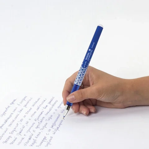 Ручка имеет корпус синего цвета с рифленой зоной захвата для комфортного и длительного использования. Цвет деталей – синий. Ручка пишет специальными гелевыми чернилами синего цвета. Снабжена ластиком для удаления надписей.