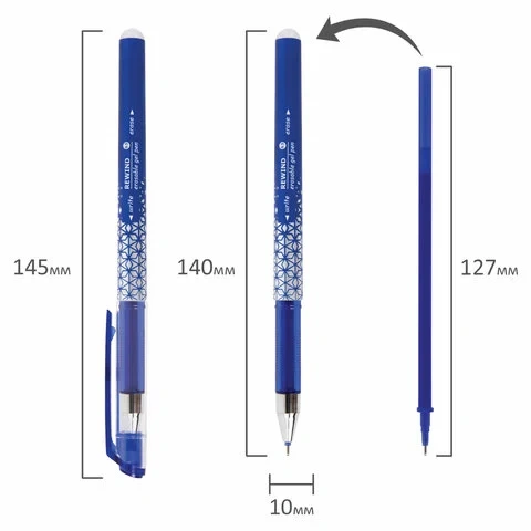 При письме и стирании бумага не повреждается, а исправления остаются незаметными. Диаметр пишущего узла 0,5 мм создает тонкую линию письма, равную 0,35 мм. В наборе ручка и 9 стираемых гелевых стержня длиной 127 мм. Цвет чернил - синий.