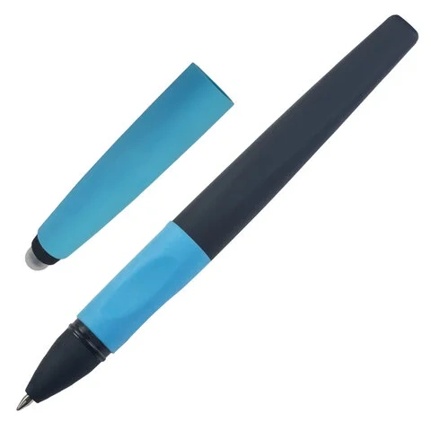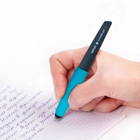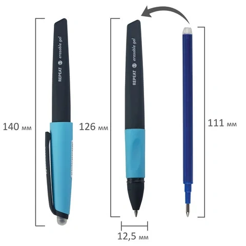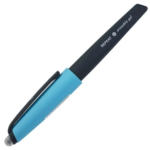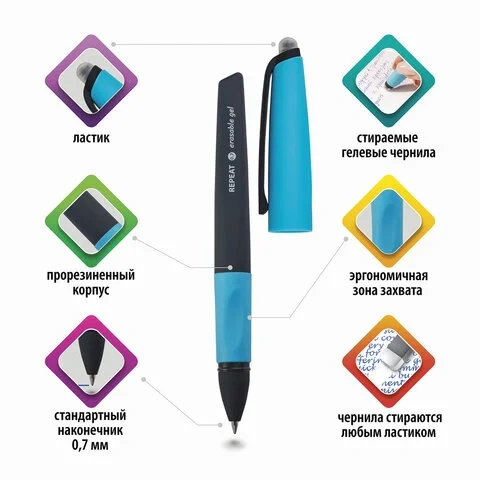Ручка имеет корпус черного цвета с эргономичной зоной захвата для комфортного и длительного использования. Цвет деталей - синий. Ручка пишет специальными гелевыми чернилами синего цвета. Снабжена ластиком для удаления надписей. При письме и стирании бумага не повреждается, а исправления остаются незаметными. Диаметр пишущего узла 0,7 мм создает тонкую линию письма, равную 0,5 мм. В наборе ручка и 3 стираемых гелевых стержня синего цвета.