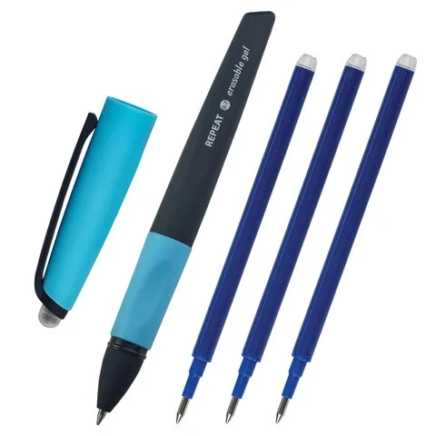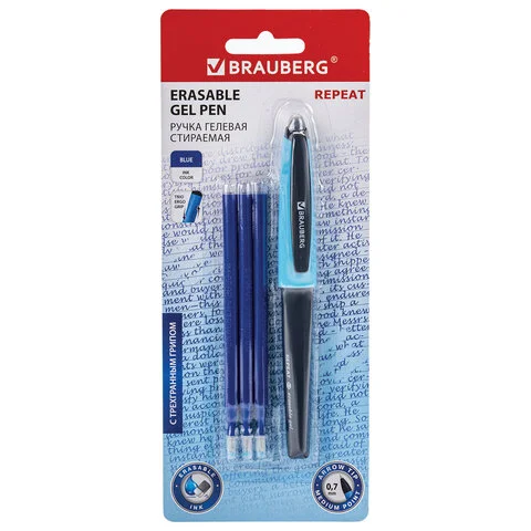 Гелевая ручка стираемая Brauberg Repeat синяя, 0.5мм, 3 стержня, голубой корпус