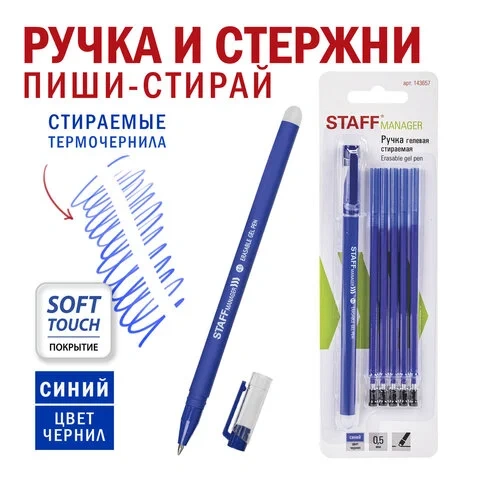 Гелевая ручка стираемая Staff Erase синяя, 0.35мм, синий корпус, 5 стержней