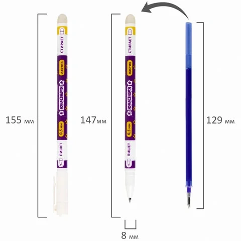 Чернила становятся невидимыми при нагревании. Нагрев достигается с помощью ластика, встроенного в корпус ручки. Чернила не размазываются и не растекаются. Возможность многократного стирания. Длина сменного стержня составляет 129 мм. Диаметр пишущего узла, равный 0,5 мм, создает тонкую линию письма, равную 0,35 мм. Пластиковый корпус круглой формы с ярким рисунком.