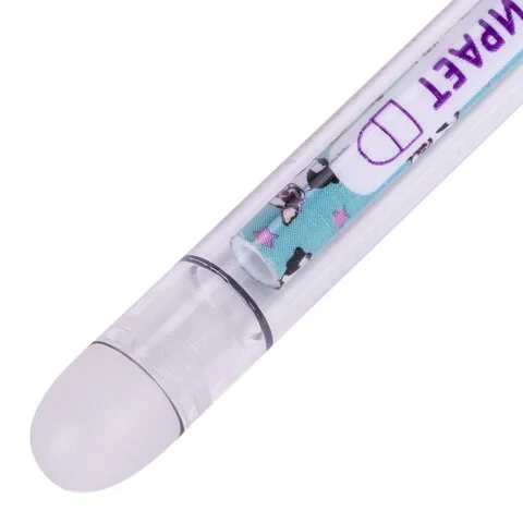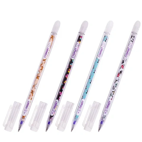 Ручка имеет круглый прозрачный корпус с изображением щенят на стержне. Наконечник стандартный. Длина сменного стержня составляет 130 мм. Диаметр пишущего узла, равный 0,5 мм, создает линию письма, равную 0,35 мм. Цвет чернил - синий. Удобный стакан для размещения ручек в розничном магазине.