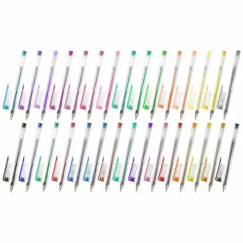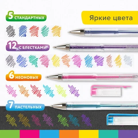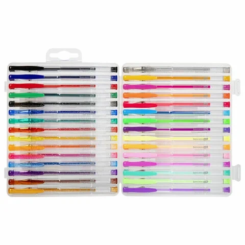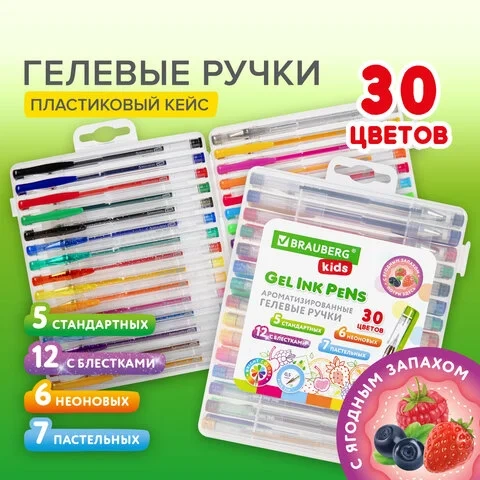 Набор включает 30 гелевых ручек: 5 ручек с классическими чернилами, 12 с блестками, 7 пастельных и 6 неоновых.
