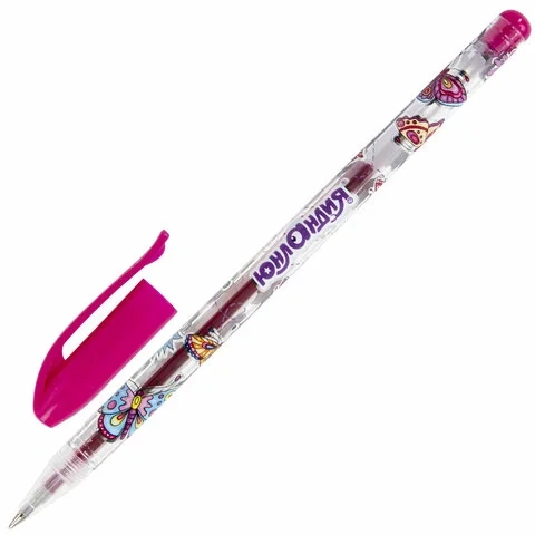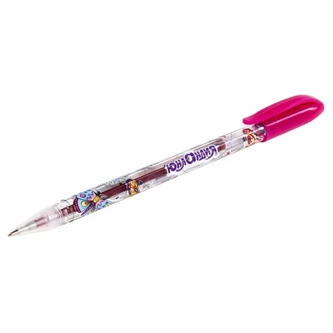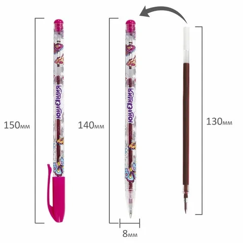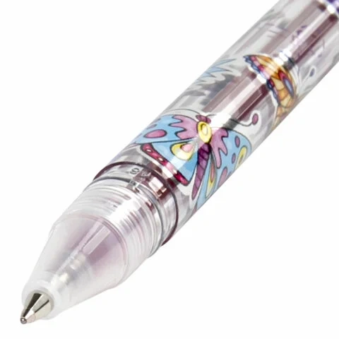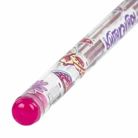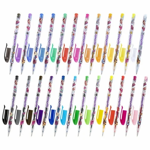 Ручка имеет круглый яркий корпус с печатью. Сменный стержень длиной 130 мм со стандартным наконечником позволит использовать ручку максимально долго. Диаметр пишущего узла, равный 1,0 мм, создает линию письма, равную 0,5 мм. Набор включает 24 гелевые ручки: 12 ручек с классическими чернилами и 12 с блестками.