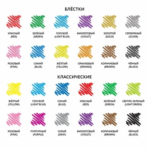 Цвет чернил с блестками: красный, зеленый, голубой, фиолетовый, золотой, серебряный, оранжевый, розовый, черный, коричневый, синий, жёлтый.