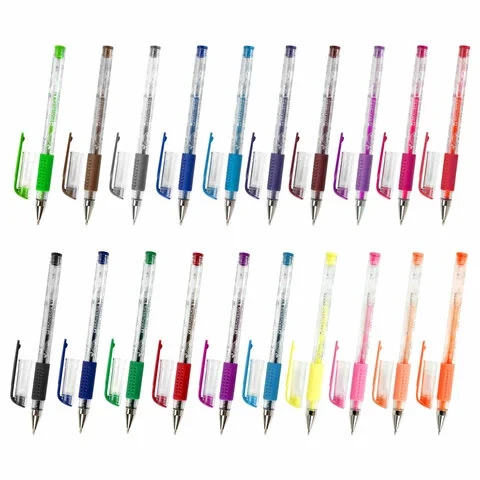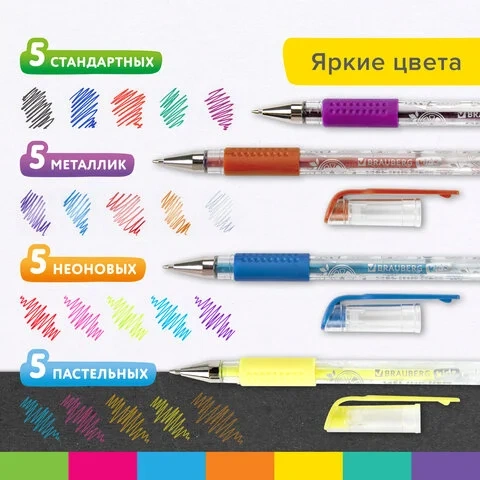 Набор включает 20 гелевых ручек: 5 ручек с классическими чернилами,10 с эффектом металлик, 5 пастельных.