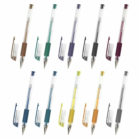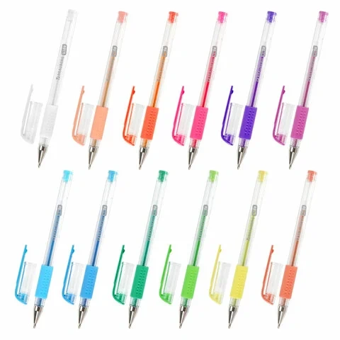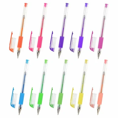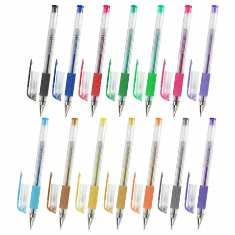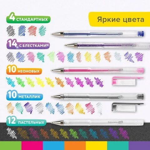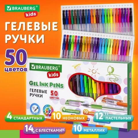 Набор включает 50 гелевых ручек: 4 ручки с классическими чернилами, 14 с блестками, 10 с эффектом металлик, 12 пастельных и 10 неоновых.