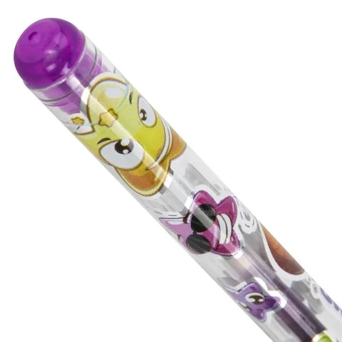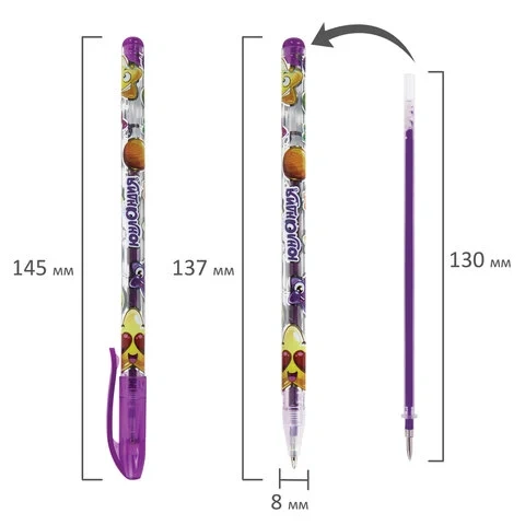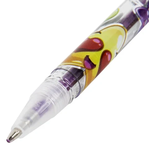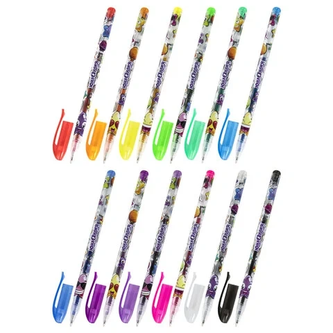 Ручка имеет круглый яркий с печатью корпус. Сменный стержень длиной 130 мм со стандартным наконечником позволит использовать ручку максимально долго. Диаметр пишущего узла, равный 0,7 мм, создает линию письма, равную 0,5 мм. Набор включает гелевые ручки из 12 различных ярких чернил с блестками: желтый, голубой, красный, черный, фиолетовый, розовый, пурпурный, серебристый, оранжевый, синий, светло-зеленый, зеленый.