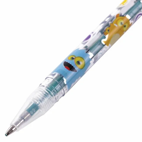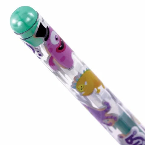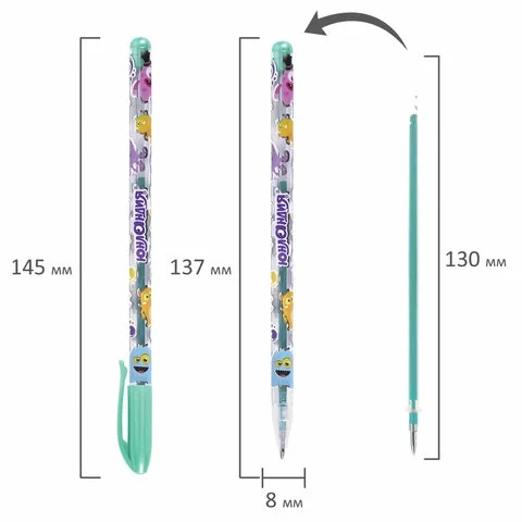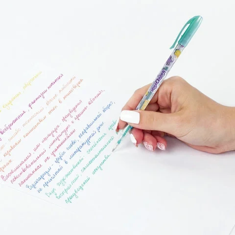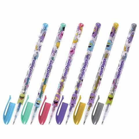 Ручка имеет круглый яркий с печатью корпус. Сменный стержень длиной 130 мм со стандартным наконечником позволит использовать ручку максимально долго. Диаметр пишущего узла, равный 0,7 мм, создает линию письма, равную 0,5 мм. Набор включает гелевые ручки из 6 различных ярких чернил с эффектом 'металлик': синий, голубой, желтый, красный, зеленый, серебристый.