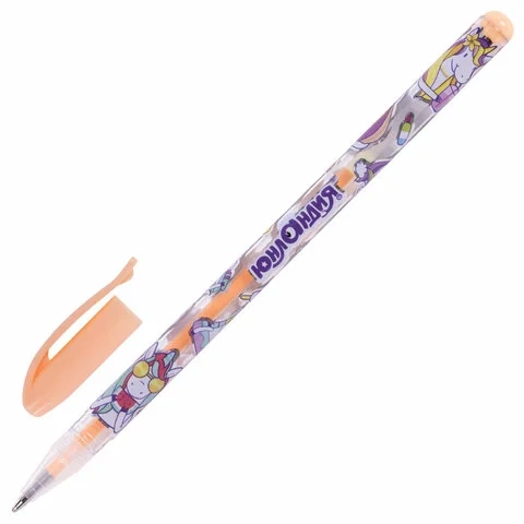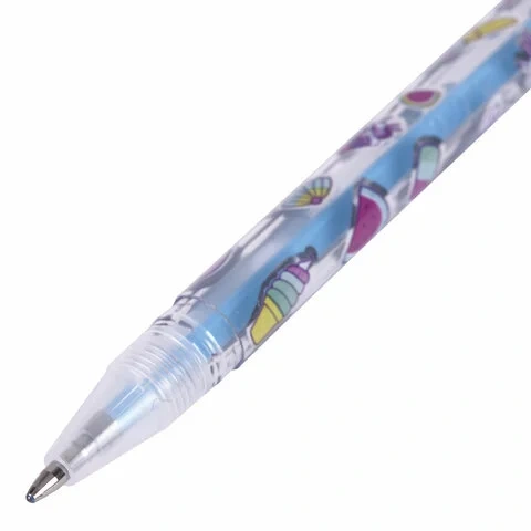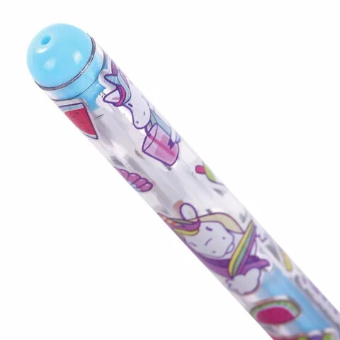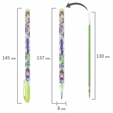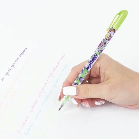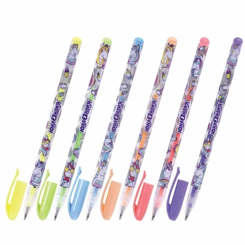 Ручка имеет круглый яркий с печатью корпус. Сменный стержень длиной 130 мм со стандартным наконечником позволит использовать ручку максимально долго. Диаметр пишущего узла, равный 0,7 мм, создает линию письма, равную 0,5 мм. Набор включает гелевые ручки из 6 различных чернил пастельных цветов: желтый, зеленый, фиолетовый, оранжевый, розовый, голубой.