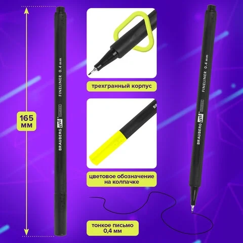 Трехгранная форма корпуса, диаметр которого равен 9 мм, позволяет удобно расположить изделие в руке. Супертонкий, износостойкий металлический наконечник 0,4 мм идеально подходит для создания точных и аккуратных линий. Цвет наконечника и колпачка соответствует цвету чернил.