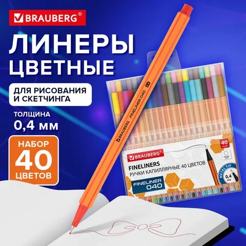 Набор капиллярных ручек BRAUBERG 'FINE 040' включает 40 ярких цветов, таких как желтый, оранжевый, розовый, красный, светло-зеленый, зеленый, голубой, синий, фиолетовый, коричневый, серый, черный, сиреневый, морская волна, небесно-голубой, мятный, черное дерево, винный, светло-серый, светло-коричневый, светло-розовый, темно-синий, пурпурный, темно-серый, баклажановый, сливовый, бежевый, сине-зеленый, виноградный, маджента, янтарный, светло-желтый, сине-серый, темно-коричневый, изумрудный, травяной, бледно-розовый.