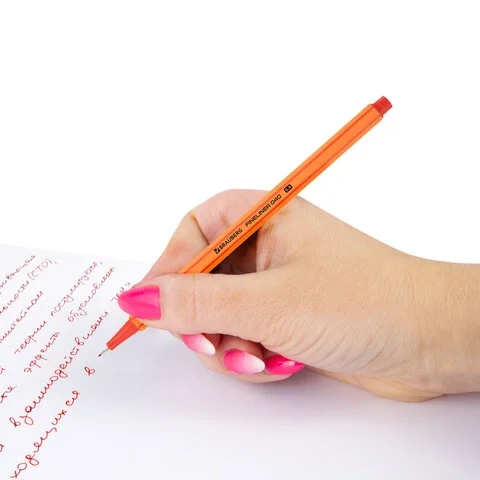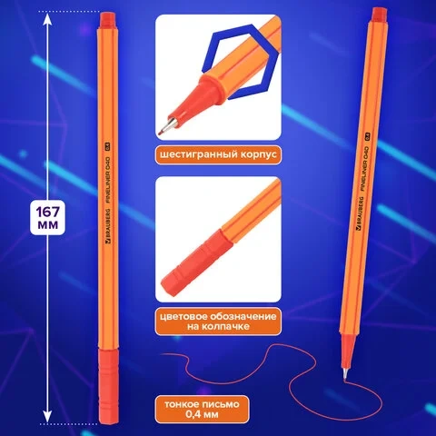 Шестигранная форма корпуса диаметром 8 мм обеспечивает удобное расположение ручки в руке. Металлический наконечник диаметром 0,4 мм позволяет создавать точные и аккуратные линии, а его износостойкость обеспечивает долговечность использования. Цвет наконечника и колпачка соответствует цвету чернил, что облегчает выбор нужного оттенка.