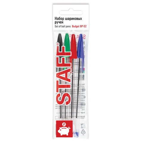 Ручки шариковые НАБОР 4 ЦВЕТА STAFF Basic Budget BP-02, письмо 500 м, длина корпуса 13,5 см, линия п