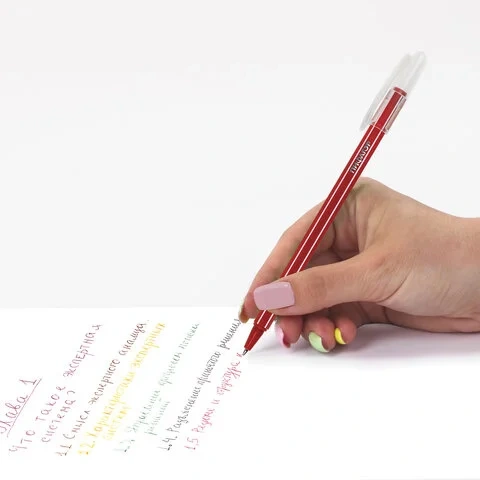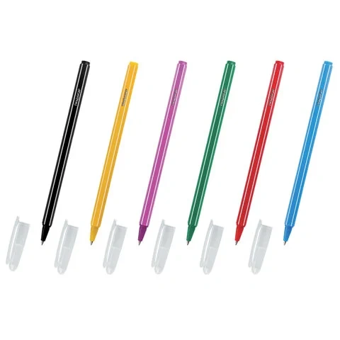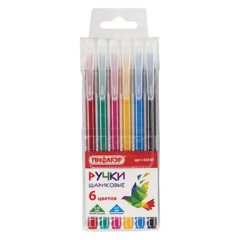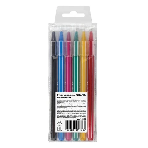 В наборе 6 одноразовых шариковых ручек с различными цветами чернил: голубой, зеленый, чёрный, розовый, красный и желтый. Удобный шестигранный корпус и яркий дизайн. Цвет корпуса соответствует цвету чернил. Диаметр пишущего узла 0,7 мм создает тонкую линию письма, равную 0,35 мм.