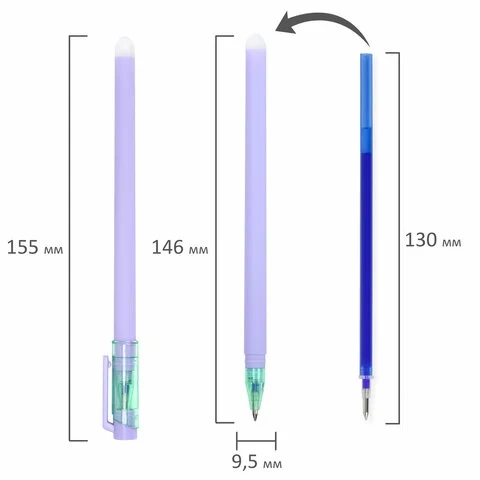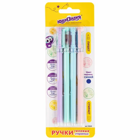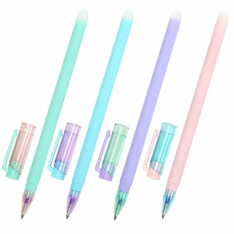 Ручка имеет круглый прорезиненный корпус в цвете ассорти нежных оттенков. Наконечник стандартный. Длина сменного стержня составляет 130 мм. Диаметр пишущего узла, равный 0,5 мм, создает линию письма, равную 0,35 мм. Возможность многократного стирания и повторного письма. Цвет чернил - синий. В наборе 4 ручки.