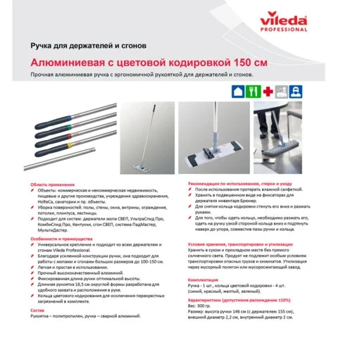 Ручка швабры Vileda Professional алюминиевая 150см, усиленная, без резьбы, 512413