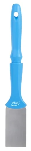 Отлично подходит для удаления труднодоступных липких отложений, засохших или подгоревших продуктов или ингредиентов. Этот скребок имеет нержавеющую гибкую стальную пластину с защищенными закругленными углами, а также высокопрочное крепление и резьбовую рукоятку, которая подходит ко всем цветокодированным ручкам Vikan. Хотя этот скребок не предназначен для чистки пола, его можно использовать для удаления небольших загрязнений на полу.