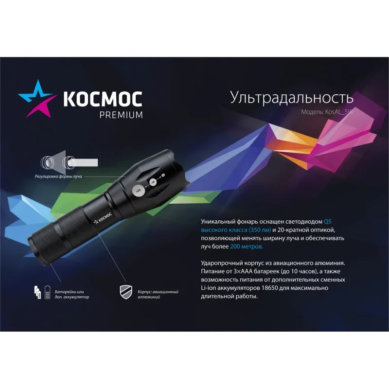 Фонарь КОСМОС Premium 5Вт Q5 LED питание 1х3.7V 18650 Li-on KosAL_5W