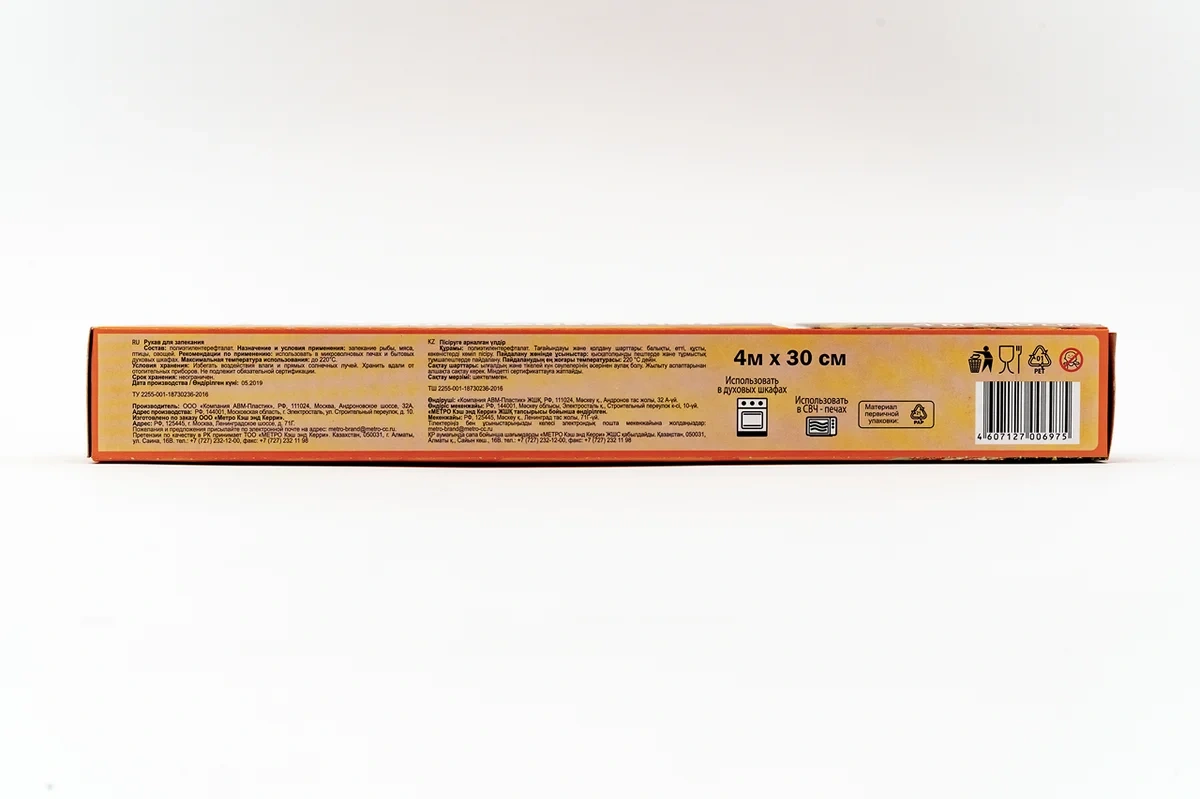 METRO PROFESSIONAL Рукав для запекания, 4 м х 30 см — отличная альтернатива приготовлению пищи на противне. Он идеально подходит для запекания мясных, рыбных и овощных блюд не только в бытовых духовых шкафах, но и в микроволновых печах. Чтобы на поверхности блюда образовалась аппетитная хрустящая корочка, рекомендуется немного отвернуть пленку незадолго до завершения приготовления. Приготовить отменное блюдо в рукаве удастся даже начинающему повару. При использовании рукава существенно упрощается процесс приготовления, нет необходимости доливать масло, перемешивать ингредиенты, менять температурный режим, опасаясь, что пища подгорит. Через тонкую прозрачную пленку, в отличие от фольги или пергамента, без труда можно отслеживать состояние запекаемых продуктов. Именно с помощью рукава можно приготовить по-настоящему полезную еду, ведь блюда в нем готовятся в собственном соку на пару, а не жарятся, как на противне. Это идеальное решение для тех, кто придерживается правильного питания. Кроме того, они не пересыхают, остаются сочными и не подгорают. А сама посуда для запекания и стенки духового шкафа не пачкаются. Использовать рукав для запекания можно при температуре до 220C, при этом пленка не должна касаться стенок духовки.